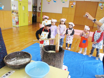 12がつ5か、ふかがわようちえんでは、おもちつきをしました。